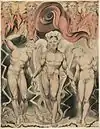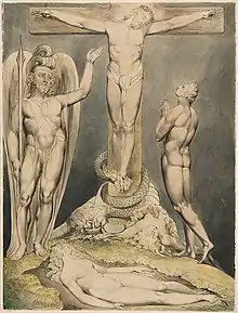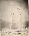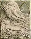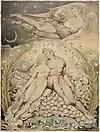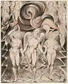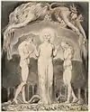 There are twelve plates in each of the Paradise Lost sets, one for each of the books in the poem. While some of these, such as Satan, Sin and Death: Satan Comes to the Gates of Hell, depict specific scenes from the epic; others, such as Satan Watching the Endearments of Adam and Eve, are syntheses of several scenes.[1] In the latter case, Blake employed visual barriers to separate the elements from different scenes, such as the arc of the bower in Satan Watching the Endearments of Adam and Eve.[2]