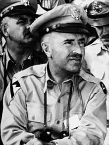The 1st Cavalry Division was down to half strength when it was withdrawn from the front line on Leyte for a brief rest in January 1945, but few reinforcements arrived before it was ordered to move to Luzon,[19] where it disembarked over the beaches at San Fabian on January 27, 1945.[20] General of the Army Douglas MacArthur ordered the 1st Cavalry Division's commander, Major General Vern D. Mudge, to conduct a rapid advance on Manila. For this, Mudge formed three flying columns.[21] Initially, Chase's 1st Brigade's mission was to follow one of the columns but on February 1 he was relieved of responsibility for the main body of the 1st Brigade and placed in command of all three flying columns.[22]
