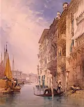 In 1829 Thales Fielding found him work as an engraver in Paris, where he worked alongside his friend Charles Bentley. While in the French capital he was encouraged by Thomas Shotter Boys to take up watercolours again.[5] After exhibiting a watercolour of Richmond Hill in the Paris salon of 1831, he was offered a job teaching the family of King Louis Philippe I of France, and for several years gave lessons to the Duc de Nemours and Princess Clémentine,[3] while his own works rapidly gained popularity in England.[5] This was helped by his influence over Francois, prince de Joinville during the turbulence of the July Revolution. Briefly the 'Callow youth' was plunged into a platonic love affair that went unrequited with the darling Princess Clementine.[6]