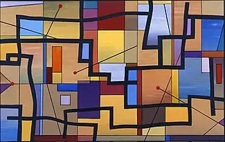 In his early career, Conger painted in a style reminiscent of Hans Hoffmann that, by 1970, gave way to work featuring hard-edged, modulated shapes set in complex juxtapositions against light grounds.[28] According to Mary Mathews Gedo, with Flossy's Night (1972), Conger's mature style began to emerge with more organic ribbon-like forms in luminous jewel tones edged in light and set against a deep red-black ground.[28] Also fully developed were his Immaculate, beautifully glazed surfaces and his "metaphysical," neon-like illumination which, lacking a visible source or cast shadows, created a surreal quality.[28][29][21] Critics like Artforum's C. L. Morrison soon noted Conger's growing assurance with color and composition, and an architectural turn employing frame-like apertures to contain his fractured, lively forms in a state of stained-glass-window equilibrium.[9][30][3]