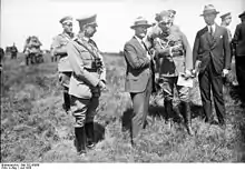 By direction of the President, under the provisions of the act of Congress approved July 9, 1918 (Bul. No. 43, W.D., 1918), Brigadier General William Durward Connor, United States Army, is cited by the Commanding General, American Expeditionary Forces, for gallantry in action and a silver star may be placed upon the ribbon of the Victory Medals awarded him. Brigadier General Connor distinguished himself by gallantry in action while serving as Commanding General, 63d Infantry Brigade, American Expeditionary Forces, in action near Mont St. Martin, France, 3 August 1918, in personally directing and controlling the attack under severe shell fire.[6]