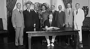 Borah considered challenging Hoover for renomination in 1932, but concluded the president's control over the party machinery, especially in the South, could not be overcome.[70] Borah disagreed with the platform of the 1932 Republican National Convention over Prohibition; after the party passed a vague compromise plank and renominated Hoover, Borah made a major address on June 20, gaining nationwide attention by attacking his party's platform for forty minutes. Between then and November, he rarely mentioned Hoover's name publicly, though he said late in the campaign that he would vote for the president. He made speeches discussing issues, not candidates, and did nothing to aid Hoover's doomed campaign against Franklin D. Roosevelt.[71] When some Idahoans demanded that he support Hoover on pain of being opposed for renomination for Senate in 1936, Borah responded that he regretted if his quarter century in the Senate had left them with the impression he might be moved by such an ultimatum.[72]