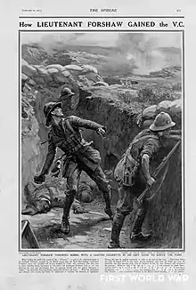 ..when holding the north-west corner of "The Vineyard" against heavy attacks by the Turks, Lieutenant Forshaw not only directed his men but personally threw bombs continuously for over 40 hours. When his detachment was relieved, he volunteered to continue directing the defence. Later, when the Turks captured a portion of the trench, he shot three of them and recaptured it. It was due to his fine example and magnificent courage that this very important position was held. [1]