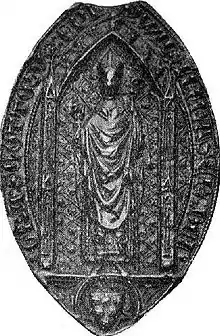 ![]() The seal of Bishop William Fraser. The other side contains his arms, making this the earliest episcopal seal from the British Isles on which the arms are represented. | |