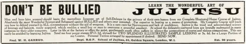 William H. Garrud was born in 1873. As a physical culture instructor, specialised in boxing and wrestling, Garrud travelled around the country teaching classes. In 1892 while giving a class in Bath, he met Edith Williams a fellow teacher of physical education.[1] They married the following year, and moved to London where William found work as a physical culture trainer for universities.[1] In 1900 they watched a Jujutsu demonstration at the Alhambra Theatre by Edward William Barton-Wright. The Garruds became students at Barton-Wright's training facility in Soho the Bartitsu School of Arms and Physical Culture,[2] the first known Japanese martial arts' school in Europe.[3] After the school closed in 1902 they continued training under Japanese jujutsu masters Yukio Tani and Sadakazu Uyenishi who opened the School of Japanese Self Defence[lower-alpha 1] at 31, Golden Square, Piccadilly Circus, London.[5] While training at the Golden Square Dojo Garrud studied with the best instructors of the time including Taro Miyake, Mitsuyo Maeda,[lower-alpha 2] Gunji Koizumi[lower-alpha 3] and Akitaro Ohno.[8]