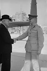 The then Brigadier Stevens greets Peter Fraser, Prime Minister of New Zealand, at Naples Airport, May 1944.