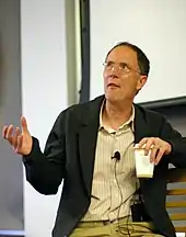 Gibson at an Amazon Fishbowl online talk show in Seattle, Washington, 2007-08-06. Gibson is a frequent guest speaker at conferences and symposia.