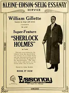 Gillette's most significant contributions to the theater were in devising realistic stage settings and special sound and lighting effects, and as an actor in putting forth what he called the "Illusion of the First Time". His portrayal of Holmes helped create the modern image of the detective. His use of the deerstalker cap (which first appeared in some Strand illustrations by Sidney Paget) and the curved pipe became enduring symbols of the character.[1] He assumed the role on stage more than 1,300 times over thirty years, starred in the silent motion picture based on his Holmes play, and voiced the character twice on radio.[2]
