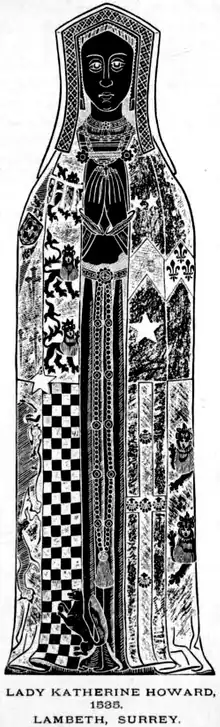 William Howard married firstly, before 18 June 1531, Katherine (died 23 April 1535), the daughter of John Broughton (died 23 January 1518)[30] of Toddington, Bedfordshire, by Anne Sapcote (died 14 March 1559), the daughter and heir of Sir Guy Sapcote by Margaret Wolston, daughter and heir of Sir Guy Wolston.[31][32] [33][34][35] They had one daughter, Agnes Howard, who married William Paulet, 3rd Marquess of Winchester. Katherine (née Broughton) was buried in the parish church of St Mary at Lambeth, where there is a monument to her memory.[35][36]