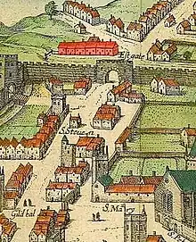 The Hurst Almshouses in Allhallows were to the exterior of the city wall, near the East Gate. The gate was demolished in 1784, and the buildings near the wall were in poor repair, as noted in a House of Commons report in 1834.[3]