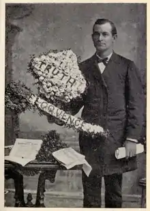 Writer Edgar Lee Masters, who witnessed Bryan's speech, remembered, "Suddenly I saw a man spring up from his seat among the delegates and with the agility and swiftness of an eager boxer hurry to the speaker's rostrum. He was slim, tall, pale, raven-haired, beaked of nose."[57] The Nebraska delegation waved red handkerchiefs as Bryan progressed to the podium;[56] he wore an alpaca sack suit more typical of Lincoln and the West than of Chicago. There was loud cheering as Bryan stood at the lectern; it took him a full minute to gain silence.[58] He began: