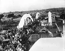 The steelwork was fabricated at the Evans Deakin & Company plant at Rocklea, and the arches had just been fixed in place when, on 5 February 1931 a major flood swept timber falsework away but fortunately the steelwork remained in place.[1]
