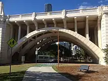 The bridge spans between ground level on the higher northern bank, ramping down to Grey Street inland from the southern bank. To achieve this, the bridge was constructed with three major spans of arched ribs across the river, with two smaller arches at the northern embankment and a single arch at the southern embankment, and a viaduct consisting of 16 spans ramping down to Grey Street to the south. The southern ramping section curves towards the southeast in plan, crossing Montague Road to align with Grey Street. The two smaller arches at the northern embankment are no longer extant, and have been replaced by precast, prestressed concrete deck units above Coronation Drive, which links onto the riverside expressway.[1]