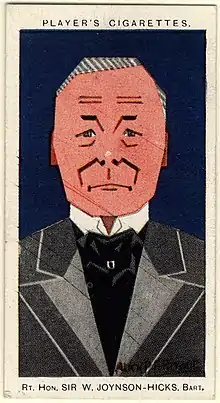 Joynson-Hicks gained personal notoriety in the immediate aftermath of this election for an address to his Jewish hosts at a dinner given by the Maccabean Society, during which he said "he had beaten them all thoroughly and soundly and was no longer their servant."[12] Subsequent allegations that he was personally anti-Semitic formed an important strand of the authoritarian streak that many, including recent scholars David Cesarani and Geoffrey Alderman, detected in his speeches and behaviour. Cesarani cautioned that "although he may have been nicknamed "Mussolini Minor", Jix was no fascist."[13] Other work has disputed the notion that Joynson-Hicks was an anti-Semite, most notably a major article by W. D. Rubinstein which asserted that as Home Secretary Joynson-Hicks would later allow more Jews to be naturalised than any other holder of that office.[14] Whether or not it was justified, the notion that Joynson-Hicks was an anti-Semite played a large part in his portrayal as a narrow-minded and intolerant man, most obviously in the work of Ronald Blythe.[15]