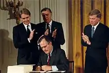 Reilly played a pivotal role in crafting and securing passage of a new Clean Air bill, enacted by Congress and signed into law by President Bush in November 1990.[2] Breaking a 10-year stalemate in reauthorizing the Clean Air Act, this law created the first full-scale, fully operational cap-and-trade system as an innovative, market-oriented mechanism to cut sulfur dioxide pollution in half at a time when acid rain was a major environmental problem. The 1990 amendments to the Act also addressed ozone depletion, established a national permits program for stationary emitting sources, promoted the use of alternative fuels, required major reductions in air toxic emissions, and laid out realistic timetables and commitments to assure steady progress in reducing ozone in cities that have not yet attained air quality standards while increasing EPA's enforcement authority.