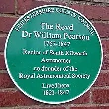 A plaque at the Rectory, South Kilworth, commemorating the astronomer William Pearson.