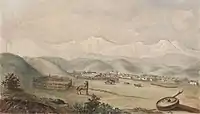 William Hutton remained in California for six years before returning east in 1853. His diaries and drawings record his travel west via Panama and his six years in California, including a surveying expedition to Los Angeles in June 1849 with Lieutenant Edward O.C. Ord.[3][4] Ord and Hutton mapped Los Angeles in July and August 1849. Lieutenant Ord surveyed the pueblo; Hutton sketched many scenes of the pueblo and drew the first map from Ord's survey, recording street names in both Spanish and English for the first time.[5][6] In July 1850, Hutton was appointed county surveyor of San Luis Obispo County, a position he held until resigning on August 4, 1851.[1][7]
