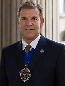 Sheriff of the City of London for 2016–17, Russell was then elected Lord Mayor on 1 October 2019, taking office on 9 November 2019.[5][6] In view of the global disruption to public life brought about by the COVID-19 pandemic, Russell was re-elected, on 29 September 2020, as Lord Mayor of London to serve a second term for 2021,[7] the first Lord Mayor to serve more than one term since William Cubitt, who was re-elected in 1861.[8] He is the fifth member of his family to have held this position.[9]