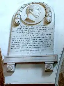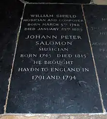 Shield is buried in the same grave as Johann Peter Salomon in the floor of the south cloisters of Westminster Abbey.[5][6] Surprisingly, it seems no marker of any kind was put in place at the time to show where he lay. There was quite a search made near the centenary of his death and eventually a small marble tablet was put as near the grave as could be ascertained.