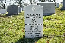 - ↑ "William Sidney Shacklette, Hospital Steward, 17 May 1880 - 12 February 1945". United States Navy. Retrieved September 23, 2010.