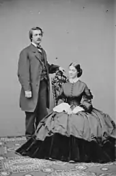 On November 12, 1863, Sprague married Kate Chase, daughter of Salmon P. Chase, the former Governor of Ohio and Secretary of the Treasury.[7] She was considered the belle of Washington. Sprague's wedding gift to Kate was a tiara of matched pearls and diamonds that cost $5700.[8] As the bride entered the room, the Marine Band played "The Kate Chase March" which composer Thomas Mark Clark had written for the occasion. Although their marriage began well, quarreling became more common. They had four children:[9]