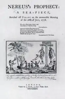 Tasker thought the results of the Seven Years' War (1754–63) had only been the growth of corruption and luxury at home.[6] He wrote several poems on the Anglo-French War (1778–83) in which he represented the Earl of Sandwich, First Lord of the Admiralty, as being at the centre of a selfish and corrupt network.[7] Tasker saw the action by Admiral Augustus Keppel at the Battle of Ushant as a great victory, which he celebrated in his poem Nereus's Prophecy: A Sea-Piece Sketched off Ushant (1779).[7] The cover of this poem has a cartoon in which Sandwich and Hugh Palliser are showing hanging from a gallows, laden with emblems that show they are guilty, while a seated courtesan weeps over their fate.[8] In A congratulatory Ode to Admiral Keppel (1779) he wrote of Keppel, whom he saw as representing the interests of the honest trading community in England,