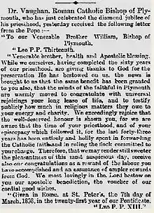 He was elevated to the episcopate as Bishop of Plymouth on 10 July 1855, a post he held until his death.[1] It is to him that the diocese of Plymouth owes its first organisation and consolidation.[2] In 1862 he was named assistant at the Pontifical throne.
