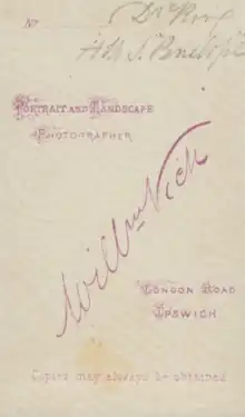 William was baptised in King's Stanley, Gloucestershire on 25 August 1833.[1] He was the son of a millwright. His first marriage was to Joyce Webb in 1858 and his initial career was as a teacher in Cainscross, Gloucestershire. Joyce bore William three sons before dying, and William remarried Mary Ann Aga in 1865. In 1868 he bought the photographic business of William Cobb of Ipswich and the family settled in London Road, Ipswich.[1] Cobb had been the photographic assistant to Richard Dykes Alexander, the prominent banker and pioneer photographer who had lived across the road from Cobb at Alexander House until his death in 1865.