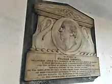 Yarrell died during a trip to Great Yarmouth and a memorial was erected in St James's Church, Piccadilly. He was buried in the churchyard of St Mary's in Bayford, Hertfordshire, with his chosen epitaph "He was the survivor of twelve brothers and sisters, who, with their father and mother, are all placed close to this spot" together with William Wordsworth's lines "first and last, The earliest summon'd and the longest spared — Are here deposited."[4]