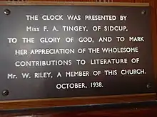 In 1919 he moved to Silverdale, Lancashire for the sake of his wife's health, and named his house, 8 Wallings Lane, Windyridge after his novel. The name was removed by subsequent occupiers, but as of 2023 the house still stands.[2] In his autobiography, Sunset Reflections (1957), he recalls tales of life in Silverdale, where amongst other activities he was chair of the Building Committee for the Gaskell Memorial Hall.[1]: 154–158 The clock on the exterior of Silverdale Methodist Church was presented to the church in 1938 "to the glory of God and to mark [the donor's] appreciation of the wholesome contributions to literature of Mr. W. Riley, a member of this church" (see photo).