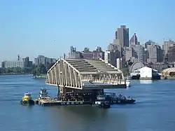 The replacement bridge was constructed at Port of Coeymans, 10 miles south of Albany. On July 13, 2010, the bridge was shipped down the Hudson on two barges that were welded together. The new bridge is 350 feet long, 65 feet high and 77 feet wide; it required three tugboats to propel it. The sight of the floating bridge caused a stir among onlookers all along the Hudson.[9] After a stay at Port Jersey in Jersey City it was towed up the East River to its destination in the morning on July 26.[10] Motor traffic was shifted to the new bridge on October 2, 2010, though the walkway of the old bridge continued to serve pedestrians and cyclists [11] for a few weeks.