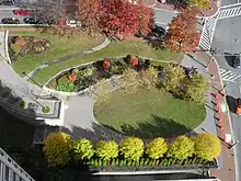 Designed by Robert (Bob) Good, of Stephenson & Good Landscape Architecture, The park is characterized by its location in the midst of high-rise luxury condominium buildings.[1] While there is some traffic noise, the park is generally quiet with few users. Sharing the intersection is a Chipotle Restaurant, the edge of the Geico Corporate campus, and another park directly across the street.