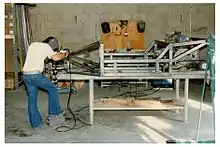 Willow frames being welded using a Miller Dialarc MIG-welder, welding shop, Seltzer Motor Industries, 9-24-79.