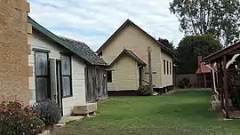 The Grayson / Glengallan Presbyterian Church was built on 0.5 acres (0.20 ha) of land opposite the Grayson School at 350 Willowvale Road (28°07′28″S 152°01′58″E / 28.1244°S 152.0328°E).[6][5][3] The land was donated by William Skerman and the church was erected using volunteer labour by local people. It officially opened on Sunday 19 September 1909.[7] By 1913 it had become known as the Willowvale Presbyterian Church.[8] In the 1950s it was relocated to Gillam Street in Glennie Heights (in the north of Warwick) to be the Glennie Heights Presbyterian Church. In 1972 it was relocated to the Pringle Cottage Museum operated by the Warwick & District Historical Society, where it was renamed Eastwell Hall after Leslie Burt Eastwell, a former president of the historical society and son of its founder.[9][10]
