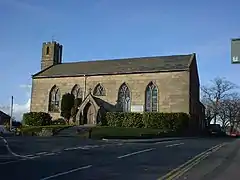 Wilnecote appears as Wilmundecote in the Doomsday Book, with eighteen households, and as Wylmyndecote in 1349.[3][4] It is an old coal mining, lime-burning and brick-making area centred on an ancient village on Watling Street. Holy Trinity Church dates back to about 1250. It was completely rebuilt in 1821 as a simple Georgian chapel with a square bell tower which overlooks the Roman road Watling Street.[5] The church design is unusual, as the entrance is halfway down the side of the building, as opposed to the end of the church. The stained glass windows in the west wall are by the renowned artist J. E. Nuttgens (1892 – 1982). The windows were installed in 1950 to mark the end of the Second World War, depicting the crucifixion (the death and sacrifice of war) and resurrection (the peace and victory). Stonydelph, which lies immediately north of Wilnecote, is a post World War II development.
