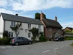 Beside the church, the oldest houses in the village include the following timber-framed cottages, with thatched roofs. Cruck End has an exposed cruck truss and is classed as "late Medieval" by Historic England.[14] The Malt House has been tree-ring-dated in part to 1410.[15][16] Number 18 has at its core an early hall house, tree-ring-dated to 1308–9.[15][17]