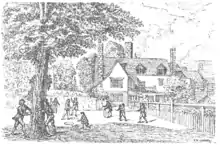 In 1845 the school was forced to close as a result of a financial scandal. This was the result of Governor James Goulston, who sued the school. Following an Order in Council of Queen Victoria in 1880, which superseded the previous Royal Charter, the school was rebuilt on a different site in Camberwell, opening in 1883. It again catered to the need for schooling of boys in Camberwell, which by this time had grown considerably from its rustic origins. Its working population largely consisted of men working in the professions, clerks, journalists, tradesmen and labourers.[9] Naturally, a grammar school provided an asset to the neighbourhood, with the prospect for boys to go on to University education. For five and a half years during the Second World War, Wilson's was evacuated to a Camp School at Itchingfield near Horsham, Sussex, and for the only period in its history became a boarding school. The whole compound stood around a broad elliptical area, set in large part to grass and the remainder, an asphalt quadrangle. Radiating from this central area, in spoke-like fashion, was a series of large cedarwood huts. These were the dormitories, ablution blocks and classrooms. Two larger buildings stood adjacent to the asphalted space, one the dining hall and the other the assembly hall which also functioned as the gym, cinema and church. The whole establishment catered for four hundred plus boys forming six houses, all named after past headmasters of the school, Nairn, Macdowell, Wilson, Kelly, Whiteley and Jephson. The Head Master of Christ's Hospital was kind enough to allow Wilson's the use of the school's cricket pitches, swimming bath and other facilities, including the Great Hall for Speech Day.[9]