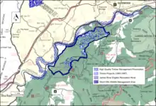 Wilson Mountain, a long ridge facing the James River with a 2044 feet elevation,[8] is composed of quartzite and metasiltstone.[9][2] This ridge is just south of the section of James River that forms the boundary between two physiographic provinces, the Blue Ridge and the Ridge and Valley. Whereas the Blue Ridge Mountains are composed mostly of granitic/metamorphic rock, the Ridge and Valley is composed of sedimentary, folded rock. Thus the area forms a habitat linkage between the two provinces.[2]