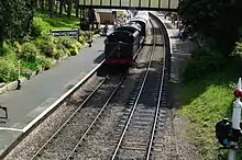 The Gloucestershire Warwickshire Railway reopened the line between Toddington and Winchcombe on 2 August 1987.[28][29] A signal box was obtained from Hall Green and rebuilt on the foundations of the original structure,[30] with the 37-lever frame coming from Honeybourne West Loop Box.[31] The former Great Western Railway station building at Monmouth Troy was dismantled stone-by-stone and re-erected at Winchcombe in 1986.[32] The platform slabs came from Birmingham Snow Hill and Cheltenham St James.[31] The only original buildings left are the old goods shed, now the main workshop for the carriage and wagon group on the railway, and the weighbridge. Bidirectional signalling has been installed as has a passing loop through the station, which has been operational since 12 July 1997. [33] Since 2012, the station, and indeed parts of the line itself, have been used for scenes in the television series Father Brown.