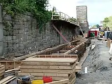 The station was closed effective January 8, 2021 due to deterioration.[25][26] On January 11, the MBTA reinstated funding for the project due to the closure.[27] The MBTA received a demolition permit on January 25.[28] Demolition of the ramps was completed in June 2021.[29][30] A $47.6 million construction contract was approved on October 27, 2021.[31] The 28-month construction phase began in December 2021.[32] Site preparation began in March 2022.[33] Demolition of the remaining platforms and ramps took place in May and June 2022. Some demolition and utility work lasted through the remainder of 2022.[34]
