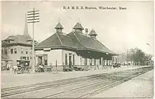 The Boston and Lowell Railroad opened between its namesake cities in 1835; local stops were added soon after.[2][3] Woburn Gates station – later Winchester – was open by 1838.[4] By the 1840s, service on the line was suitable for commuting to Boston.[2] Elimination of the grade crossing at Winchester was considered in 1903 and 1906, and again in 1915.[5][6][7] The 1915 proposal called for the tracks to be lowered by 4 feet (1.2 m) and the streets to be raised by 17 feet (5.2 m).[8] The B&M installed bike racks at the station in 1942 in an effort to reduce parking needs.[9]