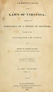 Title page of Volume 1 of Henry St. George Tucker's "Commentaries on the Laws of Virginia". This work includes lectures he delivered while operating the Winchester Law School.