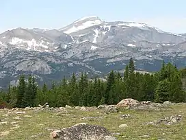 Wind River Peak (13,197 feet (4,022 m)) is the highest point in the southern end of the Wind River Range that is located in the U.S. state of Wyoming. The peak straddles the Continental Divide and is surrounded by National Forest lands.[3] The west slopes are in the Bridger Wilderness of Bridger-Teton National Forest, while the east side is in the Popo Agie Wilderness of Shoshone National Forest. In a cirque on the northeast slopes of the peak lies Wind River Glacier.[3]