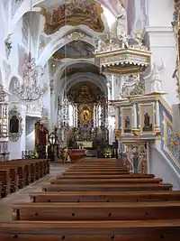 The Baroque high altar was made between 1735 and 1740, and contains a statue of the Virgin from about 1650. The pulpit dates from 1674. The stucco work in the church interior was created by Mathias Obermayr, who also made the four extremely detailed side-altars, two of which are dated 1756.