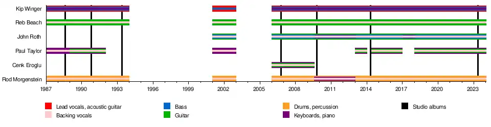 After disbanding in 1994, bassist/lead vocalist Kip Winger went on to a solo career, guitarist Reb Beach went on to touring projects with artists Dokken, Alice Cooper and has held a permanent guitar spot in Whitesnake since 2002. The band's other members pursued or resumed careers as session musicians.