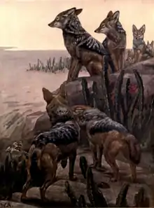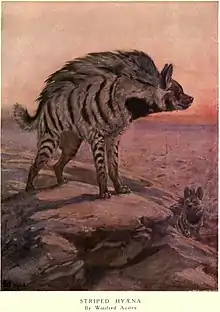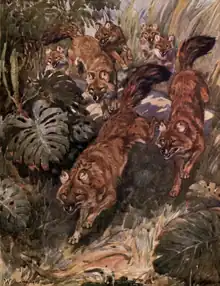 Austen's favorite subjects were wild animals and birds, and she received many commissions to illustrate magazines and books. Her etchings of animals and birds were popular in the 1940s and 1950s.[5] At the Royal Academy in London in 1903, she exhibited "The Day of Reckoning", a wolf pursued by hunters through a forest in snow. A second showed a snow scene with a wolf baying, while two others are apparently listening to him. "While the wolf, in nightly prowl, bays the moon with hideous howl," is the legend with the picture.[6][7] In 1908 Austen exhibited four works at the Royal Academy, ‘Brutus: Portrait of a Lion’, ‘The Dog and the Shadow’, ‘The Fox and the Stork’, and ‘The Wolf and the Lamb’.[3]