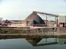 Although the mine was mothballed between 1892 and 1928, it is Britain's oldest working mine.[12] It was granted an extension to its mining licence in 2012 which will see mining continuing to at least 2047.[13] The mine produces 950,000–1,000,000 tonnes (1,050,000–1,100,000 tons) of rock salt each year (30,000 tonnes (33,000 tons) a week at peak production) and has a marketshare of around 90%.[14] During the 19th century, export of the salt was by barge or boat on the River Weaver, but when the mine reopened in 1928, a railway connection was laid.[15]