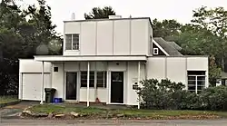 The Winslow Ames House was unlike other homes of the 1930s, it is a modular home that was constructed on a concrete slab and constructed with a welded steel framework.[2][3] The designer of the house was John B. McLaughlin Jr., who co-founded American Houses Inc. in 1932.[2] McLaughlin's designs focused on inexpensive housing through mass production and new materials and technology.[2] The International Style house was modular and intended to allow easy enlargement, dismantling and relocation of the structure if needed.[2] The houses, termed "Motohomes", featured modular "motounits" that contained heating and plumbing equipment.[2] The use of steel in the prefabricated homes would later be limited by World War II, which made steel unavailable for civilian use.[2] After the war, prefabricated homes were typically made of wood and offices were normally constructed of steel and concrete.[2]