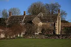 The village manor is a late-15th- to early-16th-century building of Purbeck and Portland stone with courses of flint. It was built in the sixteenth and seventeenth centuries and is a Grade I listed building.[5] It has mullioned windows and a gabled staircase turret on the west side.[3][6] Nearby is a sixteenth-century tithe-barn with a hammerbeam roof, also a listed building but falling into disrepair. In 2008, Historic England funded the erection of scaffolding and temporary repairs to the structure, but by 2016, a permanent repair had not been made.[7]