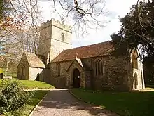 The Church of England parish church of St Peter is at the south end of the village. The earliest parts of the building are the 12th-century north doorway and blocked south doorway of the nave;[16] the nave (which has no aisles) is from later in that century. The crossing, transepts and chancel were added in the 13th century[17] and at that time the central tower was probably square, although the present tower is from the 14th or 15th century and rectangular. The nave and tower are built in flint with some ashlar dressings. Two windows were added to the nave in the 15th century, and its west end was rebuilt with a large window in the 16th.[9] At some point before 1800 the north transept was removed.[17]
